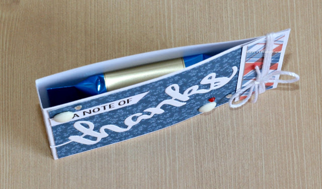 I decided to make a little matchbook that holds a piece of chocolate. I used some patterned paper that has been in my stash for over a year. The best part is, I was able to use up some of the scraps in the paper pad. I used staples to close the bottom flap of my matchbook, they are just covered up with the crochet thread. I used a word die from Pink & Main and finished off the front with some enamel dots as well as some bling. I have had the bling for a really long time, at least 2 years!